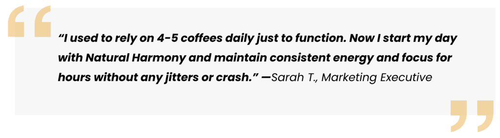 “After struggling with afternoon energy crashes for years, Natural Harmony has completely eliminated that problem. I maintain consistent energy and mental clarity throughout my entire workday.”